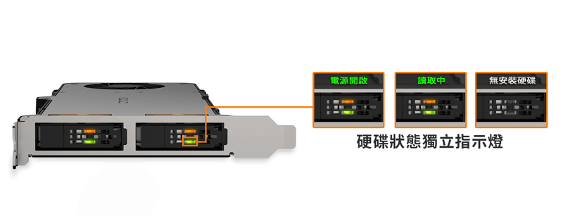 | 硬碟活動 LED 指示燈: | 電源指示燈:恆亮綠色 LED 燈 讀取指示燈:閃爍綠色 LED 燈 空間閒置指示燈:LED 燈關閉 系統自定義:琥珀黃色 |
