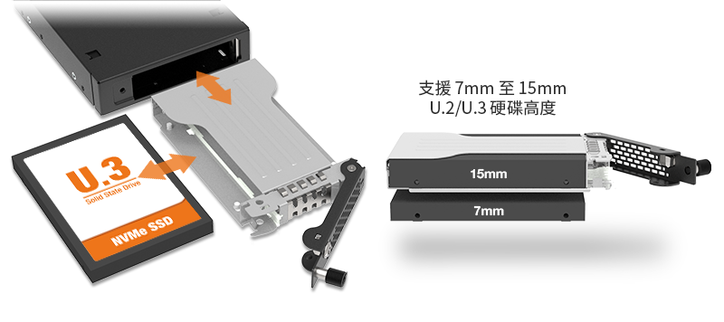 | • | 可安裝 1 顆 U.2/U.3 NVMe SSD 於 3.5 吋外部裝置空間(支援最高 15mm 高度) |