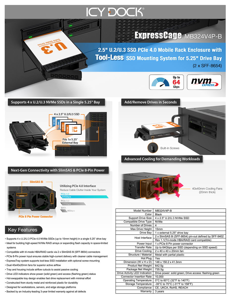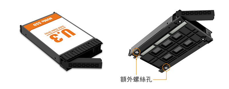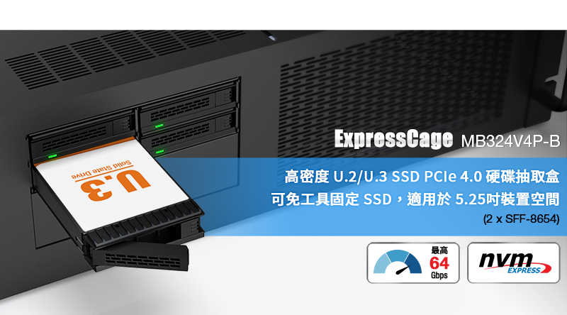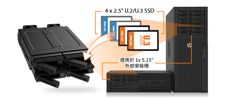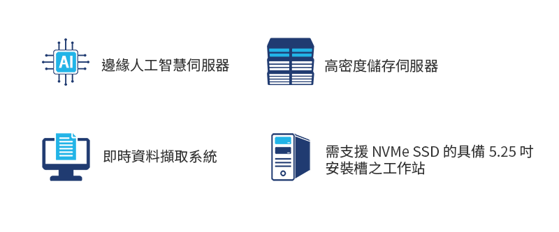 | • | 可在單一 5.25 吋裝置空間中安裝最多 4 顆 U.2/U.3 PCIe 4.0 NVMe SSD(支援最高 15mm 高度) |
