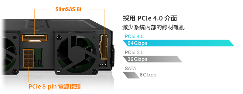 | 傳輸速率: | 每顆 SSD 最多可達 64Gbps(依實際 SSD 效能而定) |