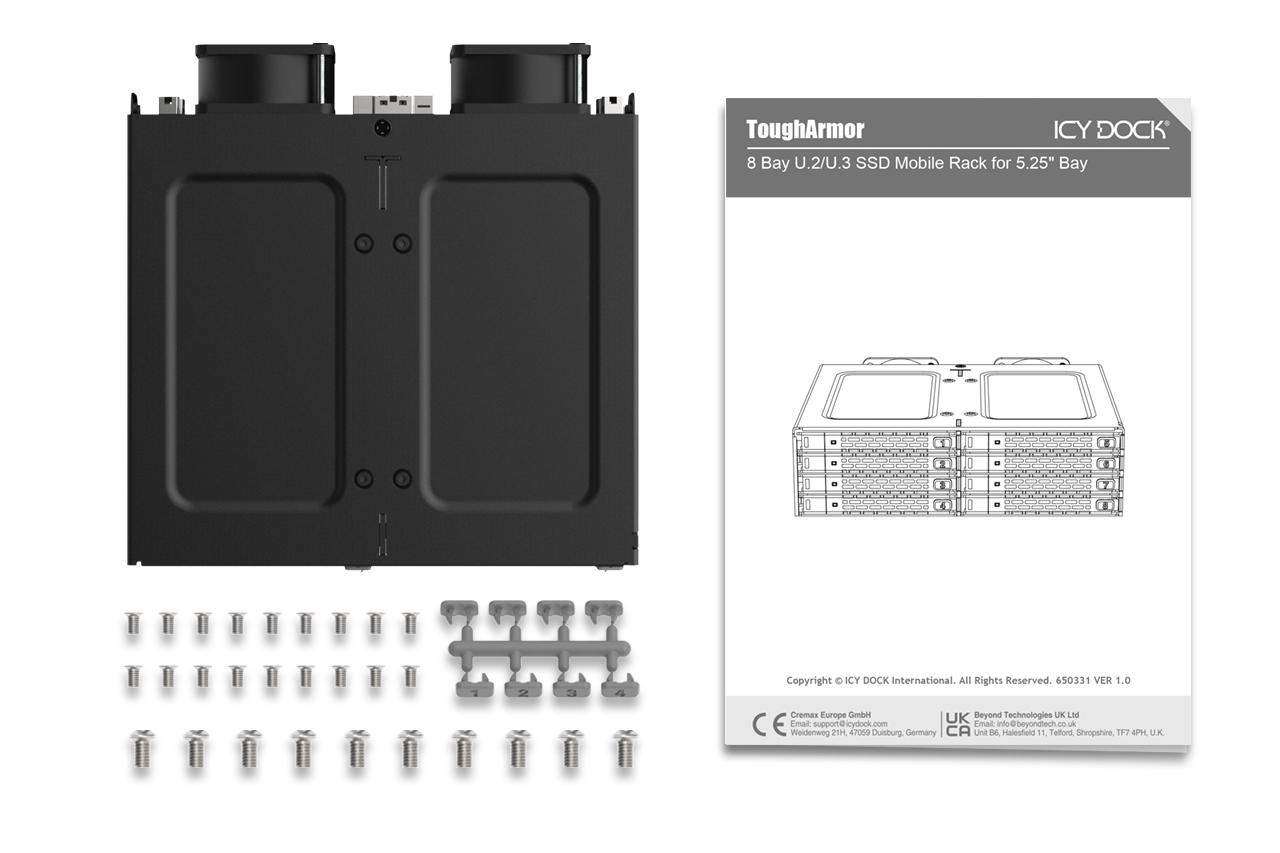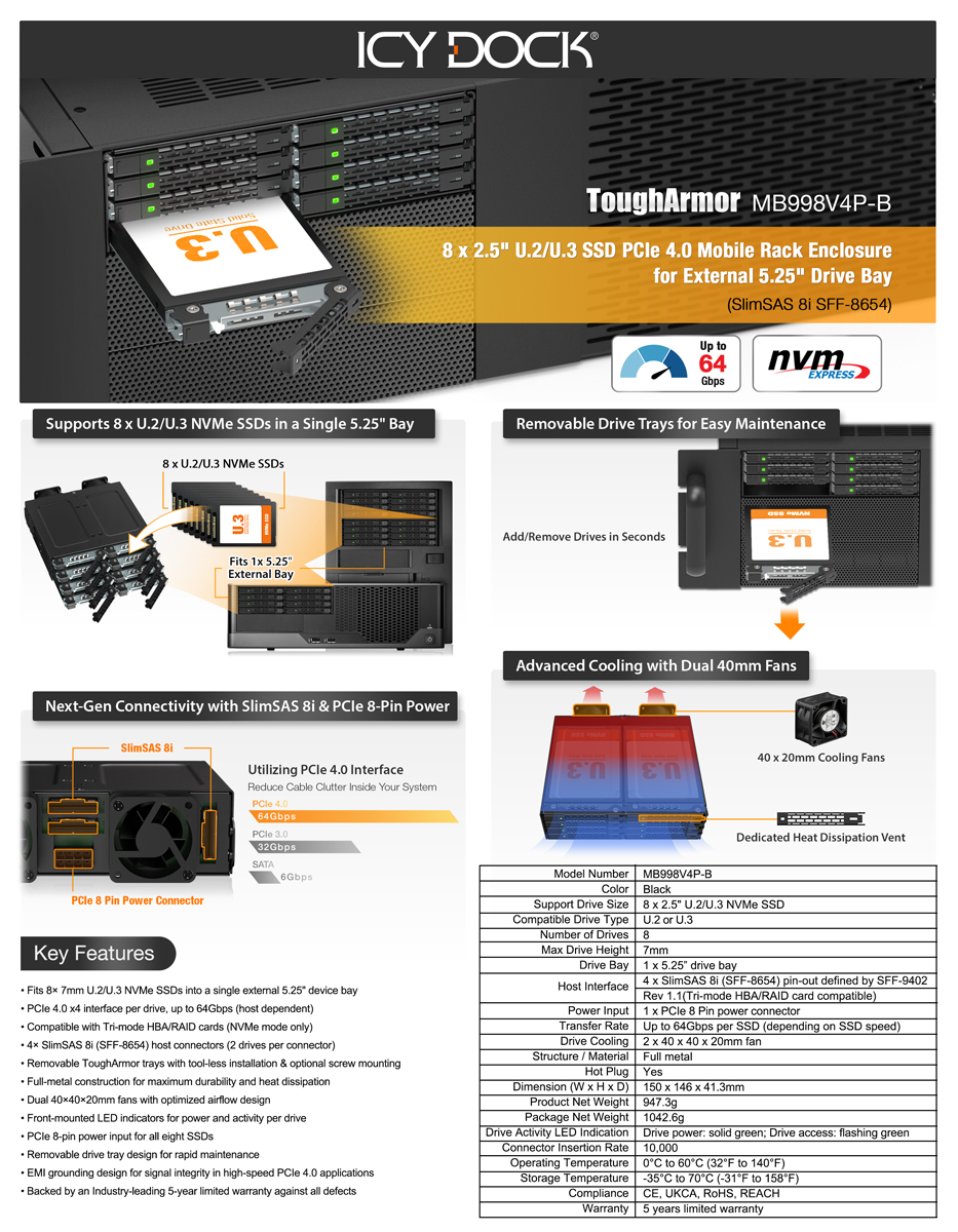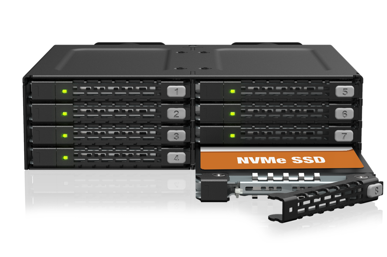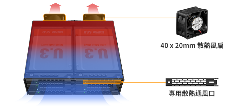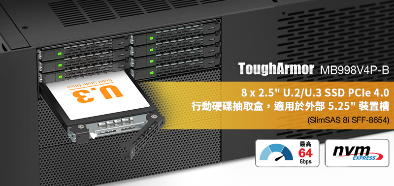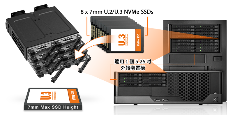 | • | 可在單一外部 5.25 吋裝置槽中安裝 8 顆 7mm U.2/U.3 NVMe SSD |