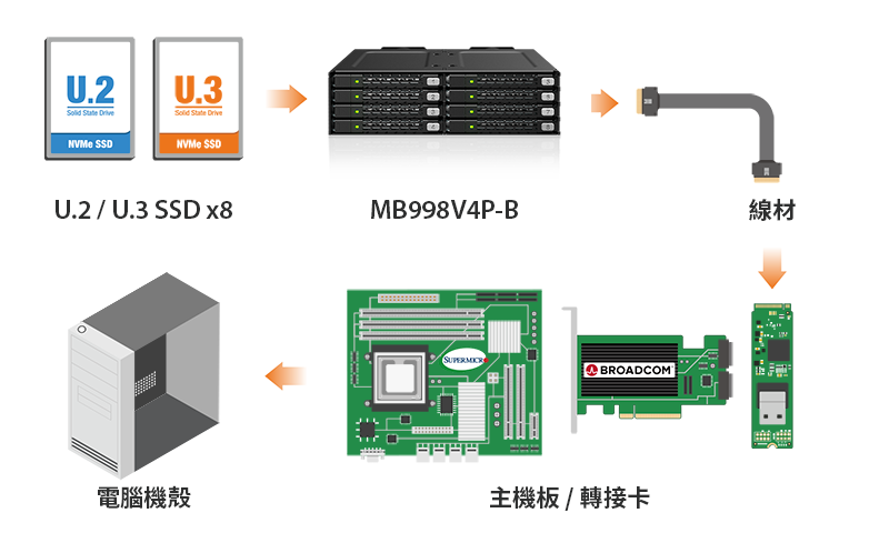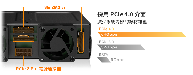 | 傳輸速率: | 每顆 SSD 最高可達 64Gbps(依 SSD 規格而定) |