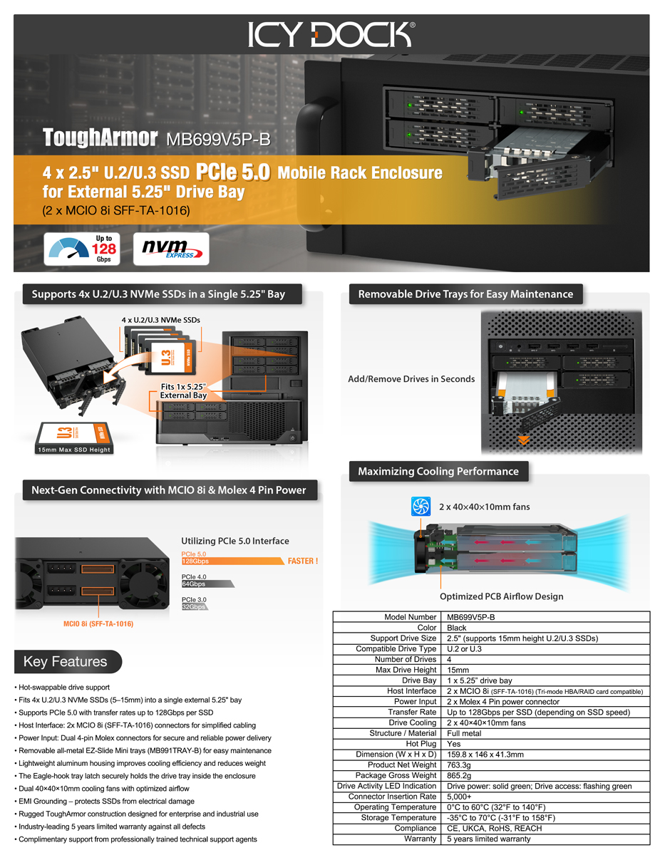 | • | 支援 PCIe 5.0,每顆 SSD 最高可達 128Gbps 傳輸速率 |