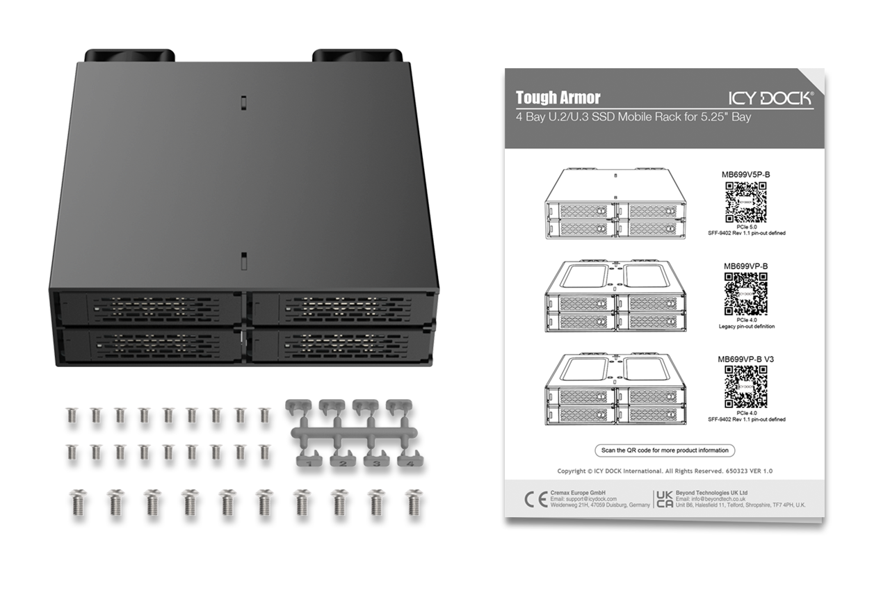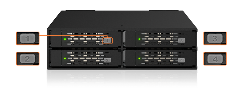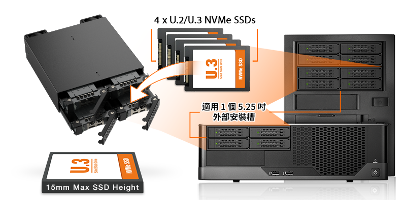 | • | 可在單一外部 5.25 吋裝置槽中安裝 4 顆 U.2/U.3 NVMe SSD(5–15mm) |