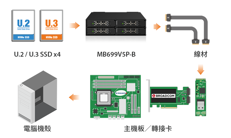 | 適用於 | 搭配具備 Legacy 腳位定義 的 NVMe HBA/RAID 卡 | 搭配具備 SFF-9402 腳位定義 的 Tri-mode HBA/RAID 卡 | 搭配具備 SFF-9402 腳位定義 的 Tri-mode HBA/RAID 卡 |