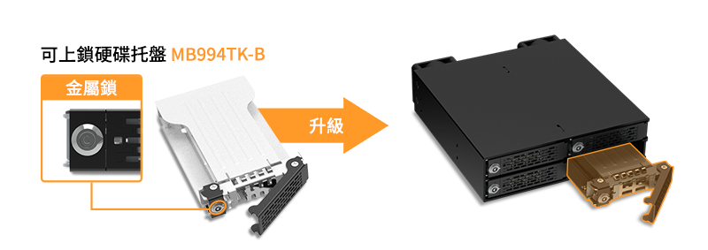 | • | Eagle-hook 托盤鎖設計,確保托盤穩固鎖入硬碟盒中 |