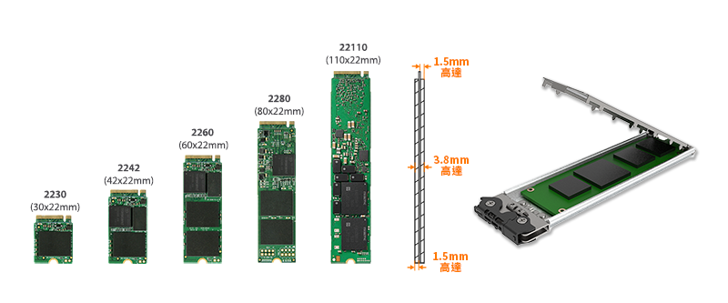 支援 1 組 M.2 NVMe SSD(2230 / 2242 / 2260 / 2280 / 22110)