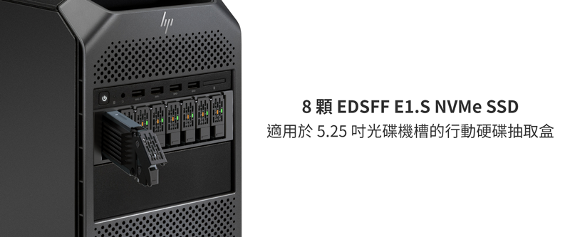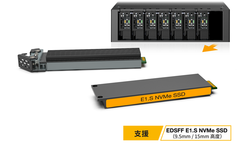 | • | 在單一 5.25 吋空間支援 8 個 15mm / 9.5mm E1.S SSD |