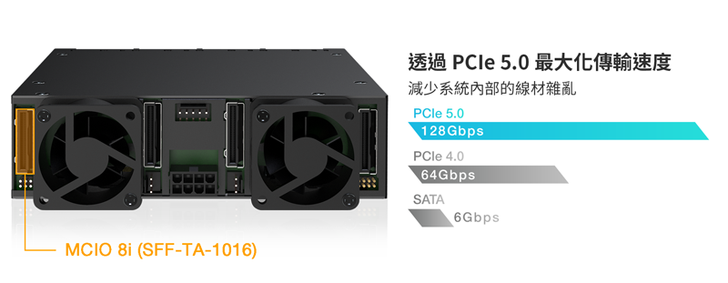 | • | PCIe Gen 5.0 x4 介面 — 每顆 SSD 傳輸可達 128Gbps |