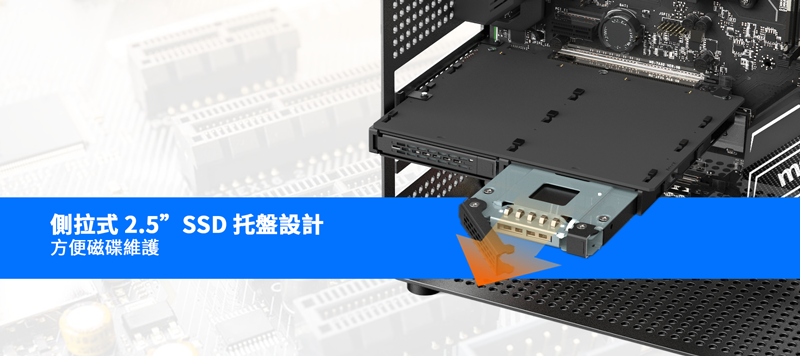 側抽式 removable tray 設計,充分利用 PCIe 插槽並簡化硬碟更換流程