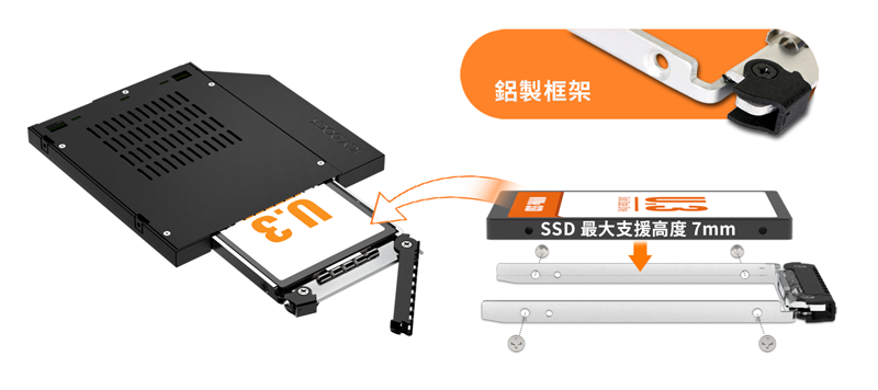| • | 將 9.5 mm 超薄型 ODD 光碟機槽轉換為可抽取式 U.2/U.3 SSD 槽 |