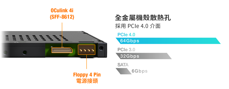 | • | OCuLink 4i(SFF-8612)介面,PCIe Gen 4 x4,最高可達 64 Gbps |