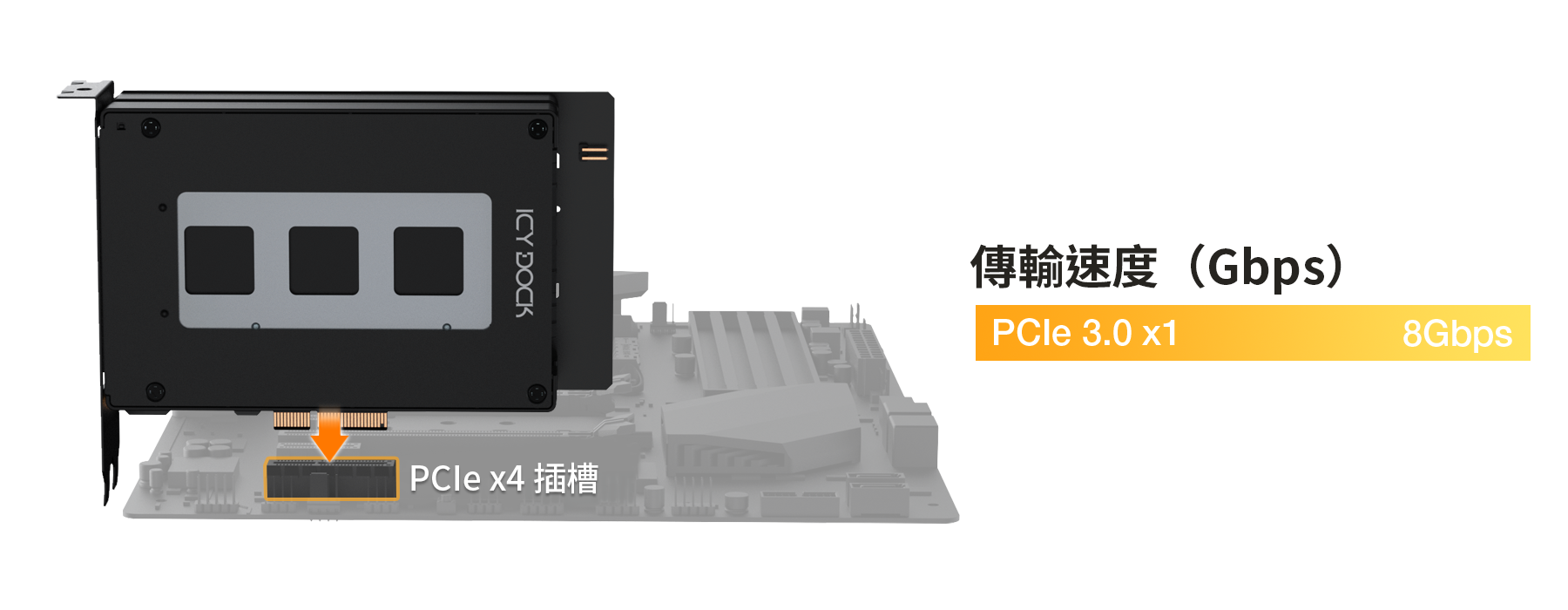 | • | PCIe x4 介面同時提供電源與資料傳輸,無需額外線材 |